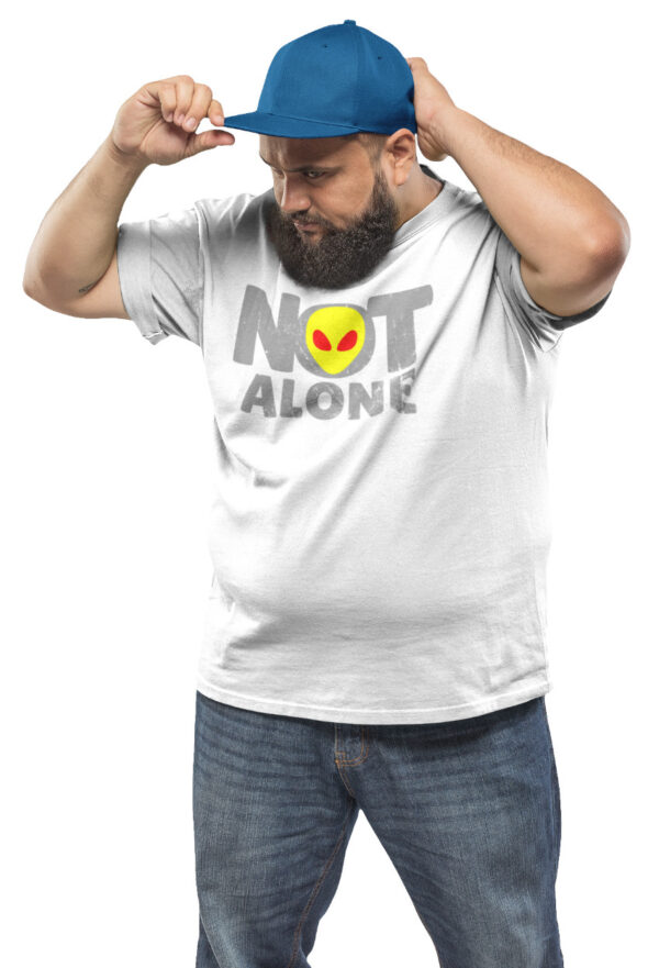 O modelo Not Alone foi criado pensando em quem não se sente só no universo. Se alguém vier perguntar “nossa, você é tão legal, por que não tem ninguém?” você já terá a resposta estampada no peito hahaha! O alienígena é um desenho clássico que foi combinado com a tipografia para dar um efeito visual mais forte.